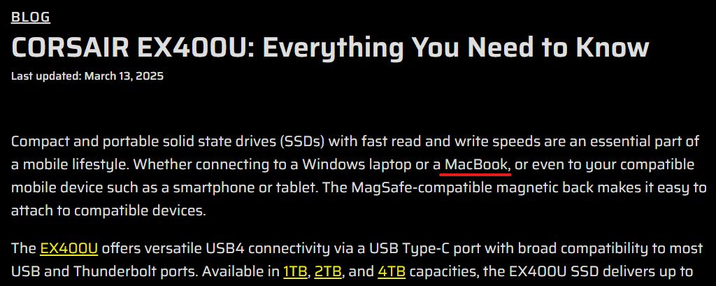About 4 months ago I bought a brand new 2024 M4 MacBook Pro. I also just received a new Corsair EX400U USB4 SSD to backup my files from my old Windows PC.