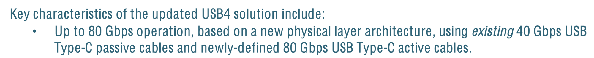 Having said that, USB's own language is unclear—when they say up to 80 Gbps using existing 40 Gbps passive cables, do the mean they're going to increse the frequency, such that some current 40 Gbps passive cables will handle 80 Gbps, and some won't?