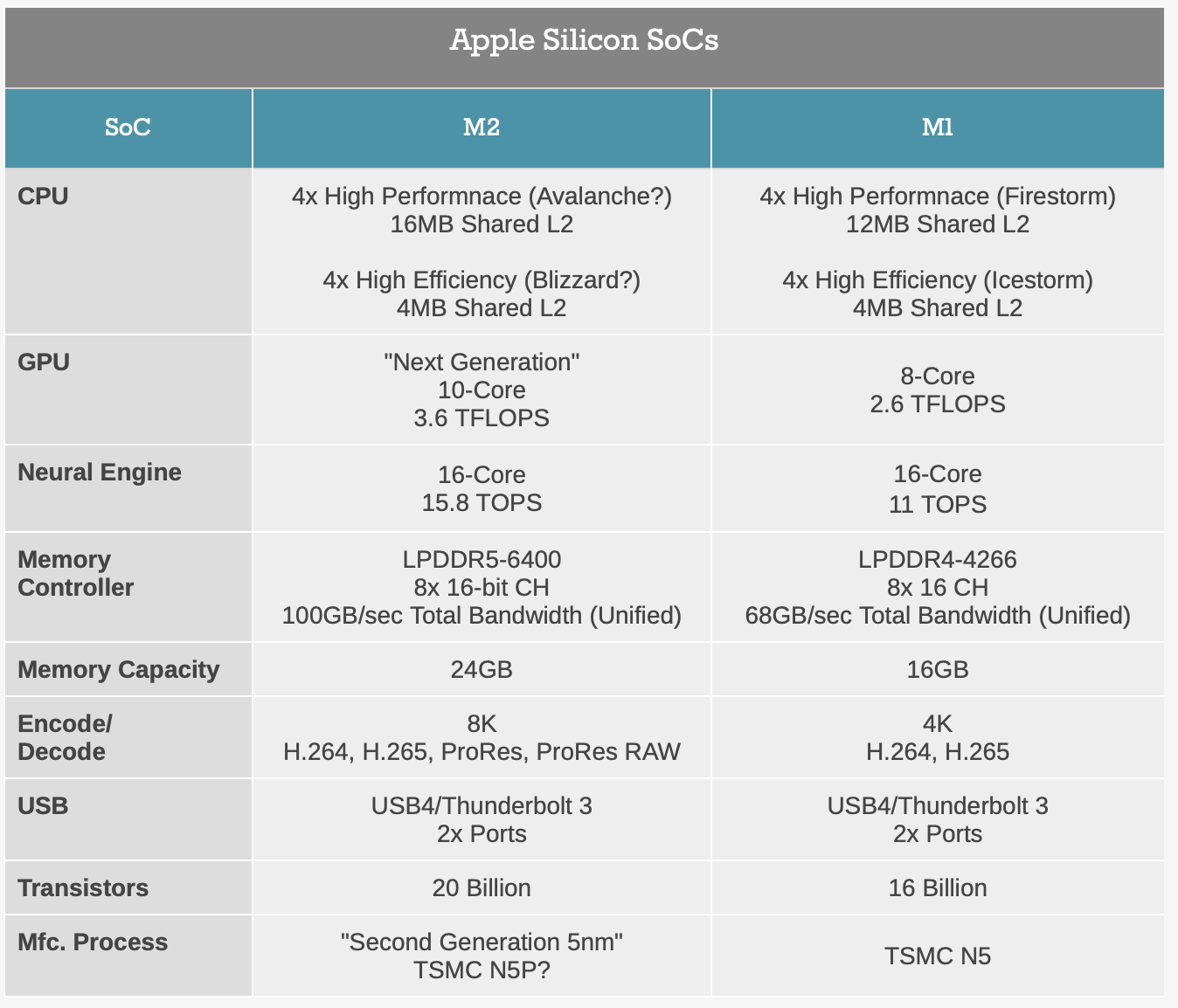 M2 with 10 core CPU and 24 core GPU (this will be a binned 32 GPU processor with core purposely disable). I believe that thermal restraints will limit these machine to the 24 cores but still allow over 3 times the GPU performance of the M1