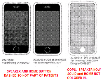The rejected patent (D618,677 - far right) filed Nov 2008 unfortunately includes a solid speaker grill (which immediately means it's not an invention that was already part of the original, oops). Plus it fails to color in the Home button hole, which is why the re-examiner said it meant its dashes were showing a hole instead of just a non-included visual reference like the other two did.