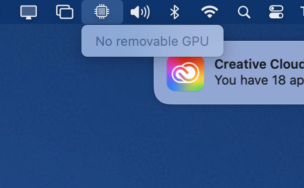 - eGPU turns on (blue light) but is not recognized in menu bar. In hardware settings it is shown under "thunderbolt" but not under "PCI" or "Graphiccards/Displays"