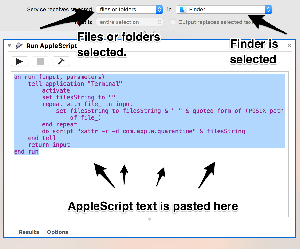 Code:on run {input, parameters} tell application "Terminal" activate set filesString to "" repeat with file_ in input set filesString to filesString & " " & quoted form of (POSIX path of file_) end repeat do script "xattr -r -d com.apple.quarantine" & filesString end tell return input end run