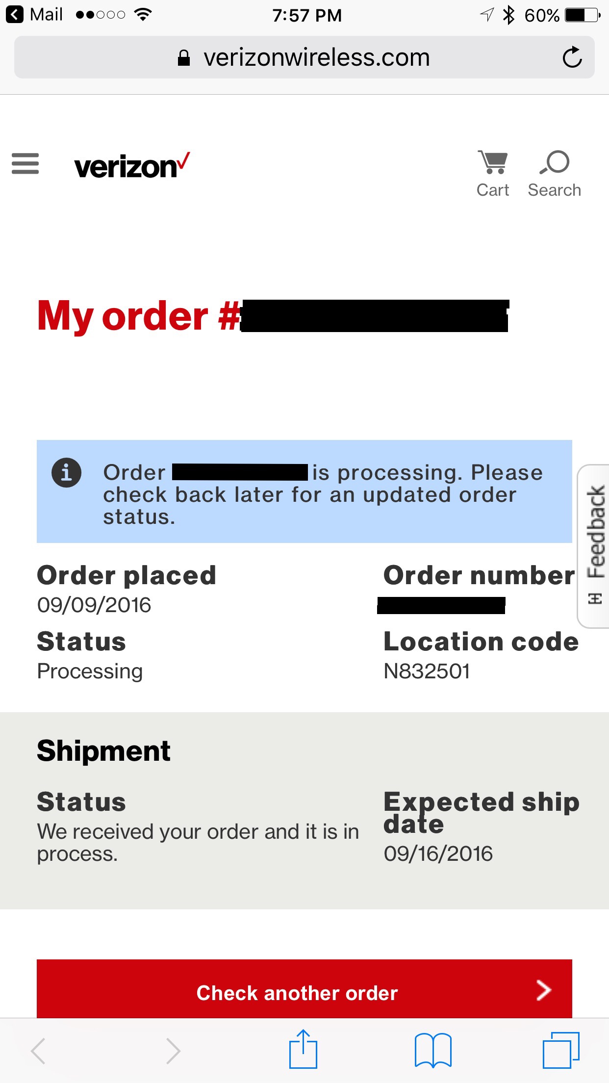 I'm guessing Verizon is west coast."Order date: 09/08/16"