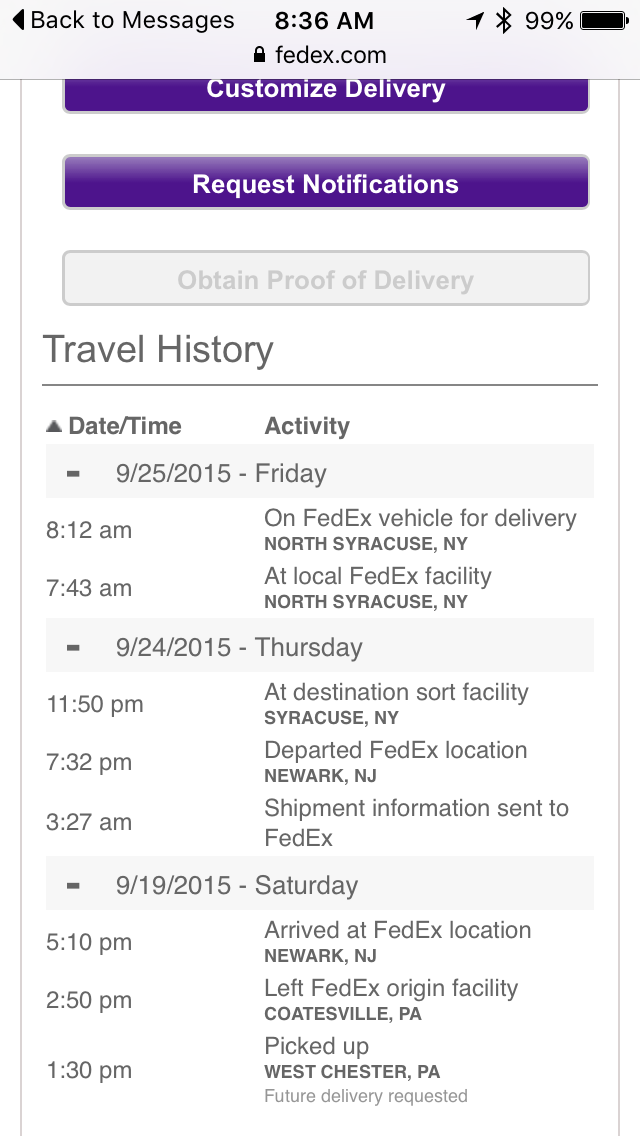I wish mine had gone through FedEx, because I have one just down the street from my house (literally it's less than a block away), and last time I got a package from them it couldn't have been any later than 8:30 AM... but since I just bought the house and have zero idea what time UPS comes I decided to go for the hub. MiPhone (what I name all of my iPhones) is about 45 minutes north and arrived there about 2 hours ago. My guess is I will be able to pick up my phone when they open at 9.
