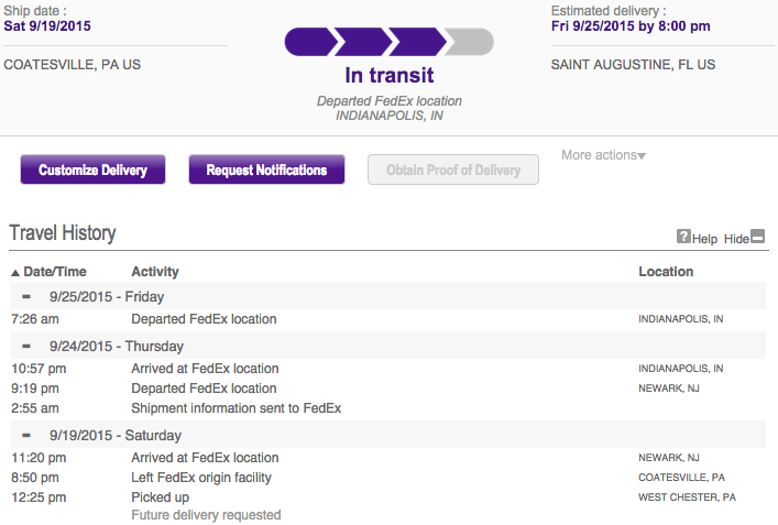 I'm assuming they went air from there to here (the Jacksonville hub), and then they'll be on a truck for delivery, just surprised I haven't seen an "Arrived at FedEx Location ... Jacksonville"
