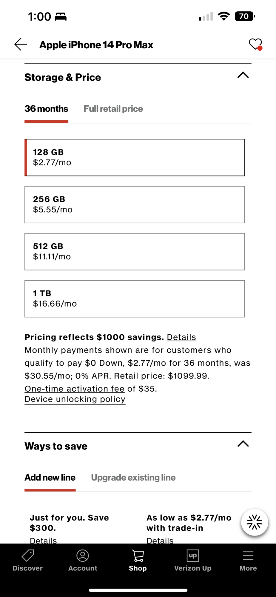 I've been on the fence about upgrading my 12 Pro Max 256GB to 14 Pro Max or 14 Pro through Verizon. The 14 Pro 128GB has been sitting in my cart for days. It clearly shows I would get $800 for the trade-in divided over 36 months, which makes the monthly payment $5.52