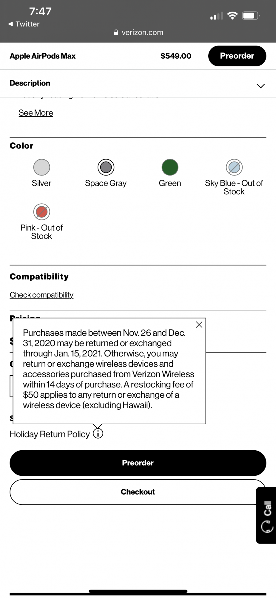 Other colors are in shorter supply, with Verizon estimating orders for AirPods Max in green will ship around January 8, while sky blue and pink are simply sold out.