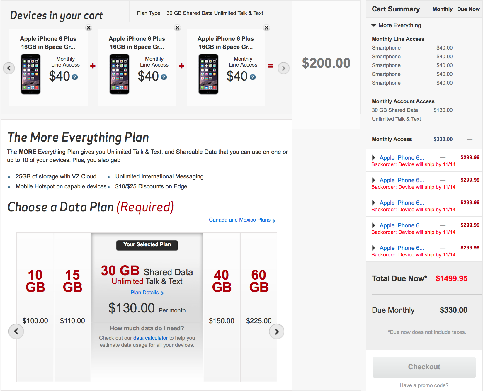 Actually, it is. Go to verizonwireless.com and pick one of the advertised bundles. When you add the devices to get access to that bundle, each one will require its own $40 monthly fee. So that $130 for 30GB really turns out to be $200 more to total $330 per month when you want to share it across five smartphones. Here's the proof: