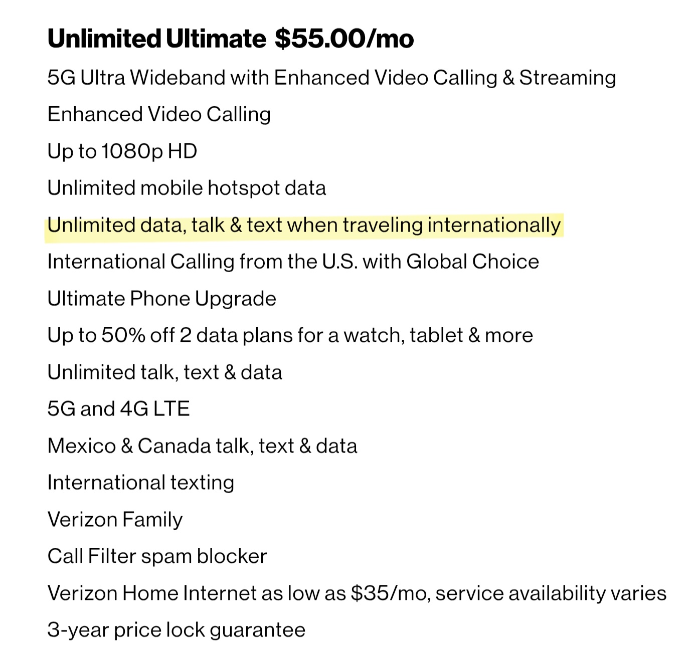The Verizon Ultimate Unlimited is actually a pretty good option in my mind and I've switched two lines to UU ahead of our trip to Europe. For us, Verizon UU is only $55/month and a better alternative than the $100 International plan add-on. There are three of us traveling but my main line has banked 14 free TravelPass days so that will cover me for the entirety of the trip. When we did a Mediterranean cruise two years ago I used Google Fi for the second eSIM and that worked well (for Android), but this time UU looks more attractive for two iPhones and free TravelPass on my Fold6.