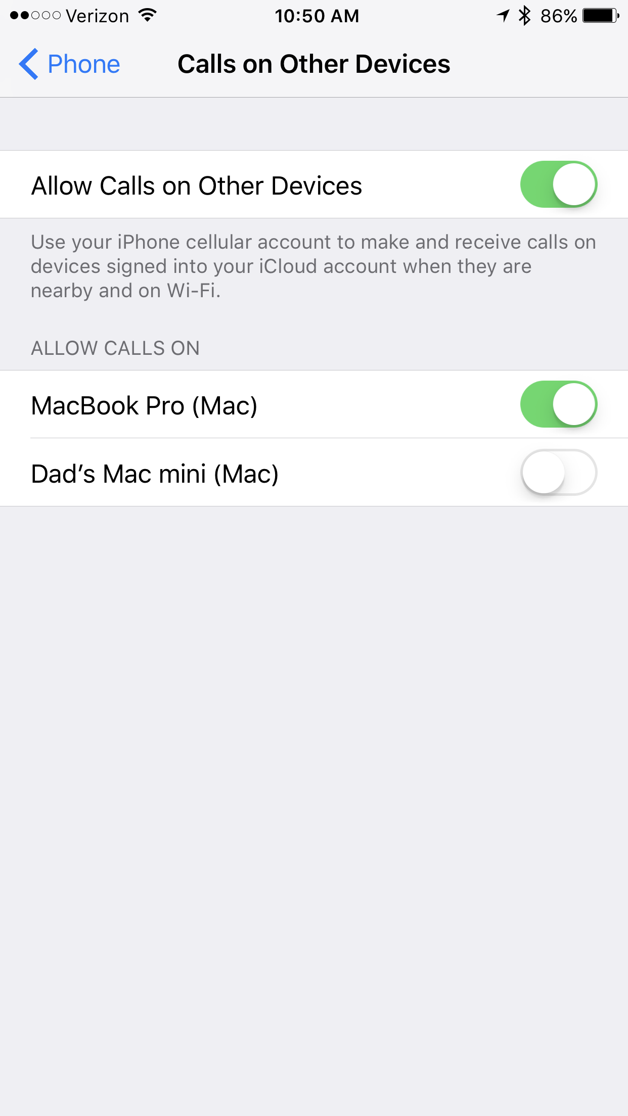This article is about the Continuity feature "Allow Calls from other devices." I actually wasn't aware of any limitation by Verizon. Literally switched to Verizon about a week ago... during this time, I never experienced any interruption of this feature... and I am not on any betas. Here are screencaps from my iPhone 7 Plus on 10.2.1 and my Macbook Pro on 10.12.2.