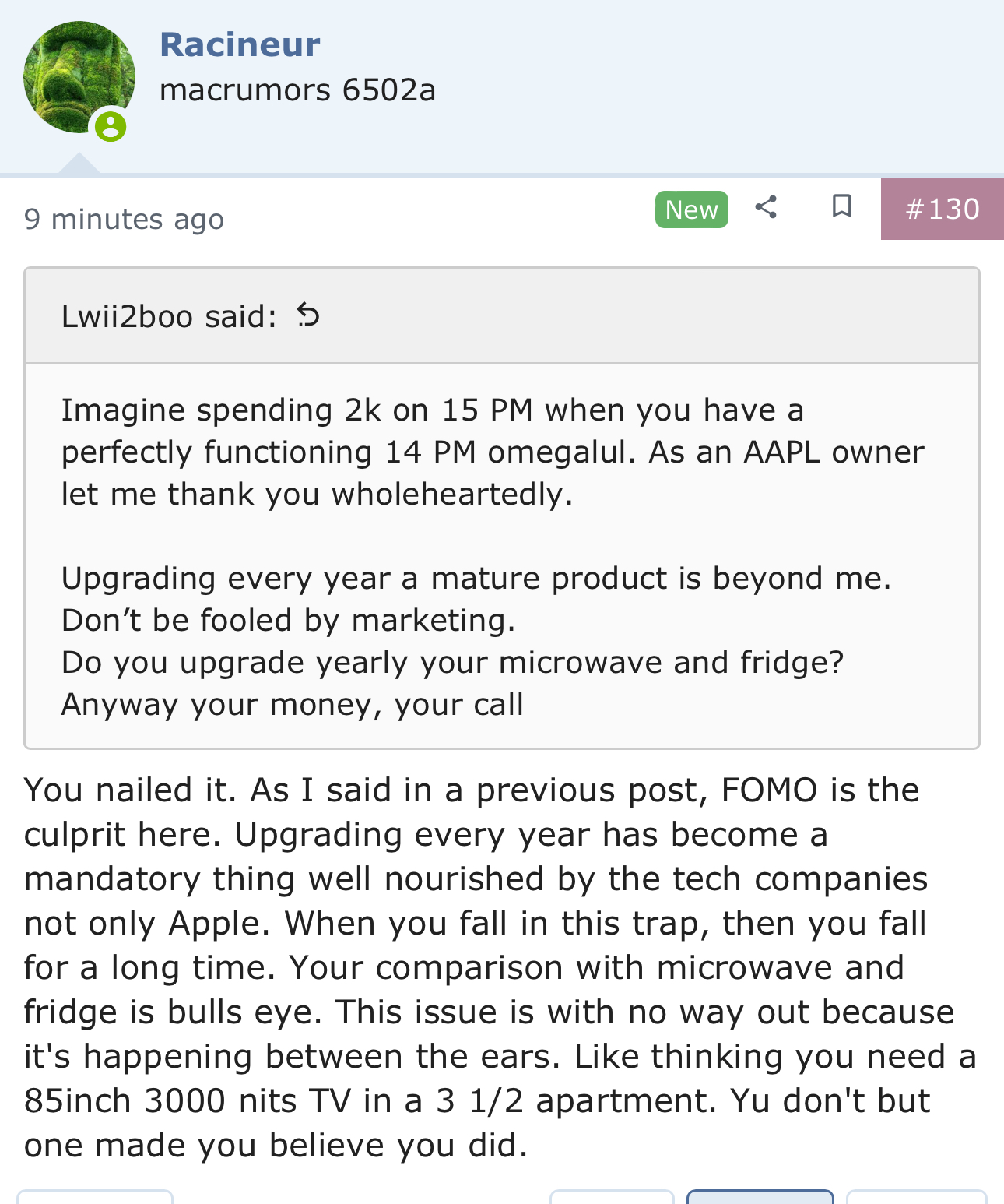 You nailed it. As I said in a previous post, FOMO is the culprit here. Upgrading every year has become a mandatory thing well nourished by the tech companies not only Apple. When you fall in this trap, then you fall for a long time. Your comparison with microwave and fridge is bulls eye. This issue is with no way out because it's happening between the ears. Like thinking you need a 85inch 3000 nits TV in a 3 1/2 apartment. Yu don't but one made you believe you did.Imagine spending 2k on 15 PM when you have a perfectly functioning 14 PM omegalul. As an AAPL owner let me thank you wholeheartedly.