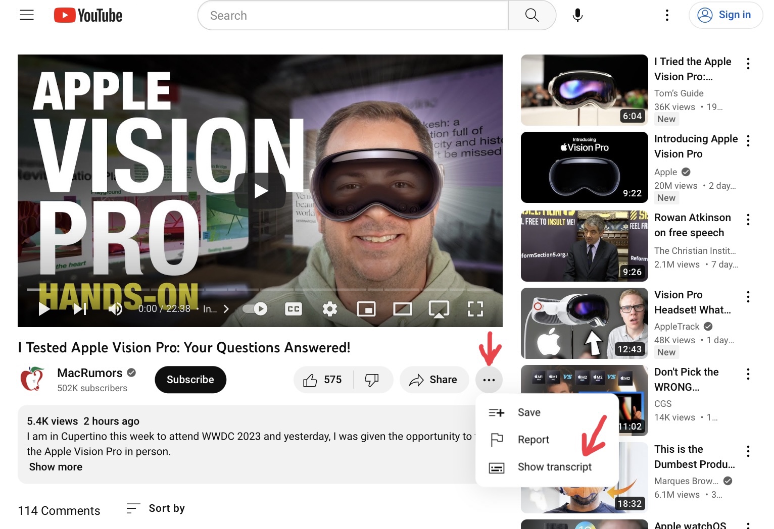 There's also sites that let you download the transcript, like this:If you’re on mobile, you need to switch Safari to Request Desktop Website. Then there’s “Show transcript” in the video’s “…” menu. This works for me without being signed in to YouTube.