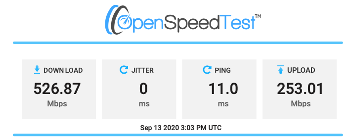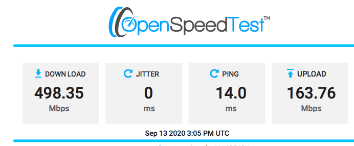 Last winter I upgraded to 400/400 mbit FIOS which didn't cost any more. Recently, they gave me an unsolicited free trial of gigabit FIOS but I didn't feel the increase was worth the additional $20/month. Anyway, there are lots of different ways to check speed, but just for fun I used OpenSpeedTest and got the following from my 2018 Mini with hardwired gigabit ethernet