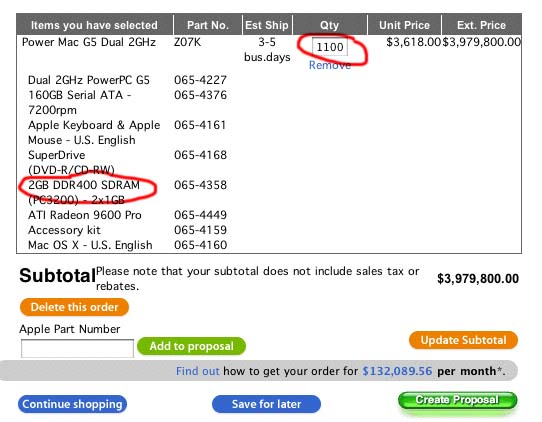 Proof? Infiniband came in at $1.5 million for the cards, routers and cabling (according to the person who runs the VA Tech cluster) which means that the G5 systems cost was around $3.7 million. Every other vendor who could meet the target quoted a price of $8-10 million (again, this is according to VA Tech).