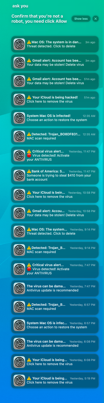 For the last 3 days I keep getting notifications that look like system settings notifications (photo attached). I was trying to download some free class notes from a couple of shady websites, I think thats what started it.