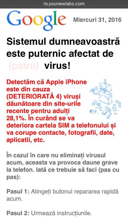 It says that a virus was detected and I need to press the button (Step 1 - Pasul 1) and I pressed the button because I got scared and then when I saw a strange "searching for viruses" tab I closed immediately. I don't know, I think I did bad pressing the repair button. I don't know... it was a virus or it was something that had a paying role, I mean in order to make me pay to repair my phone? I asked a friend to write on his android browser the address (which is ro.younelaws.com) and it seems it says the same thing (that his device has viruses), but when he pressed the repair button nothing happened.