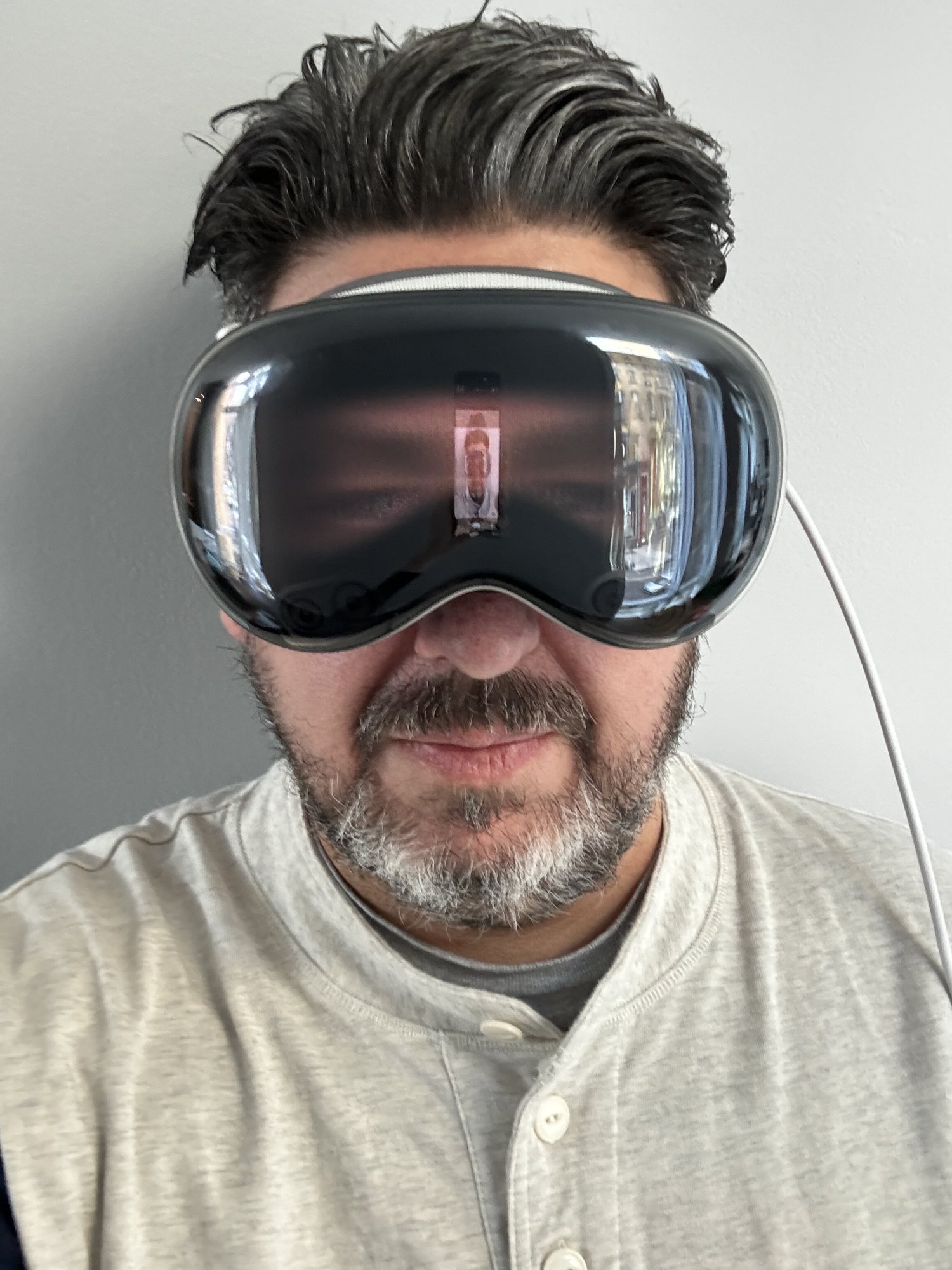 Second is the fact that Vision Pro is heavy. I’ve used it for hours at a time without any discomfort, but fatigue does set in, from the weight alone. You never forget that you’re wearing it. Related to Vision Pro’s weight is the fact that it’s quite large. It’s a big-ass pair of heavy goggles on your face. There’s nothing subtle about it — either from your first-person perspective wearing it, or from the third-person perspective of someone else looking at you while you wear it.