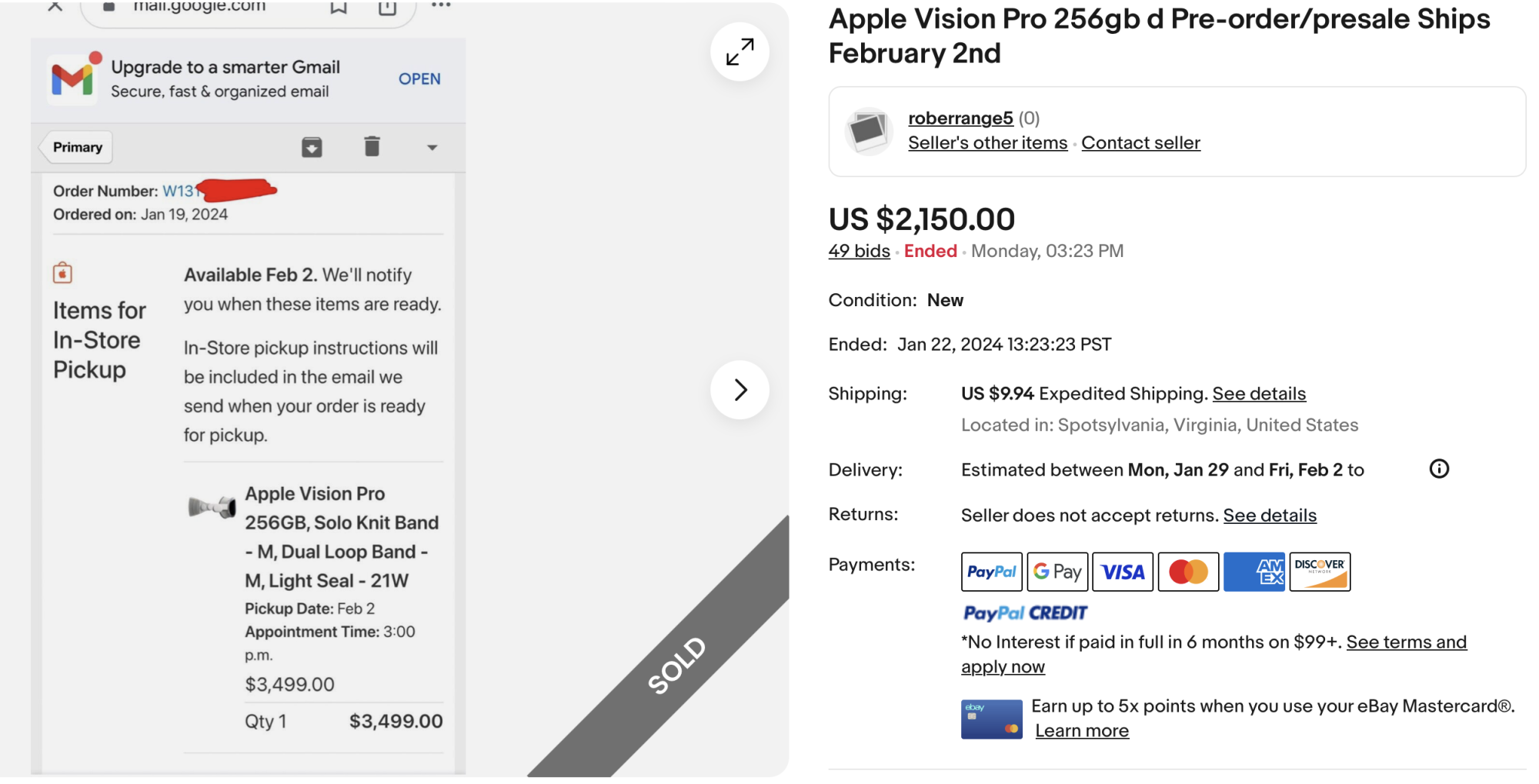 I think that's just showing proof he bought one and has one coming. A lot of people are showing their order confirmation. I'd assume he'd be picking it up and then shipping it to the buyer. Either way, I don't think you can pre-order online, but pay in store...can you?This is an in-store pickup slot. Have they even paid in full? Or does this person who buys the slot have to still pay for Vision Pro when they get there? lol.