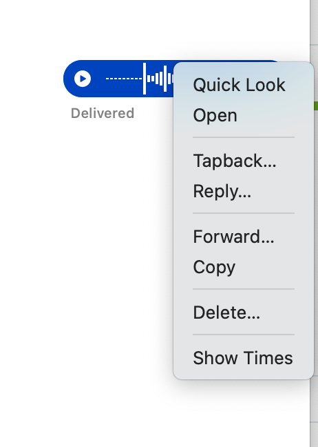 What messenger version are you using?I've done it. When you right click on a voice message (created via Dictation), do you see this menu? From there you can copy it and paste it wherever you'd like to save it. It saves as a .caf file.