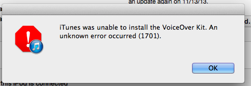 I have an iPod shuffle, and I love the versatility of it when in conjunction with VoiceOver, however, today I synced my iPod for the first time under Mavericks and found out that I had missed checking the option to download the VoiceOver Kit for my iPod.