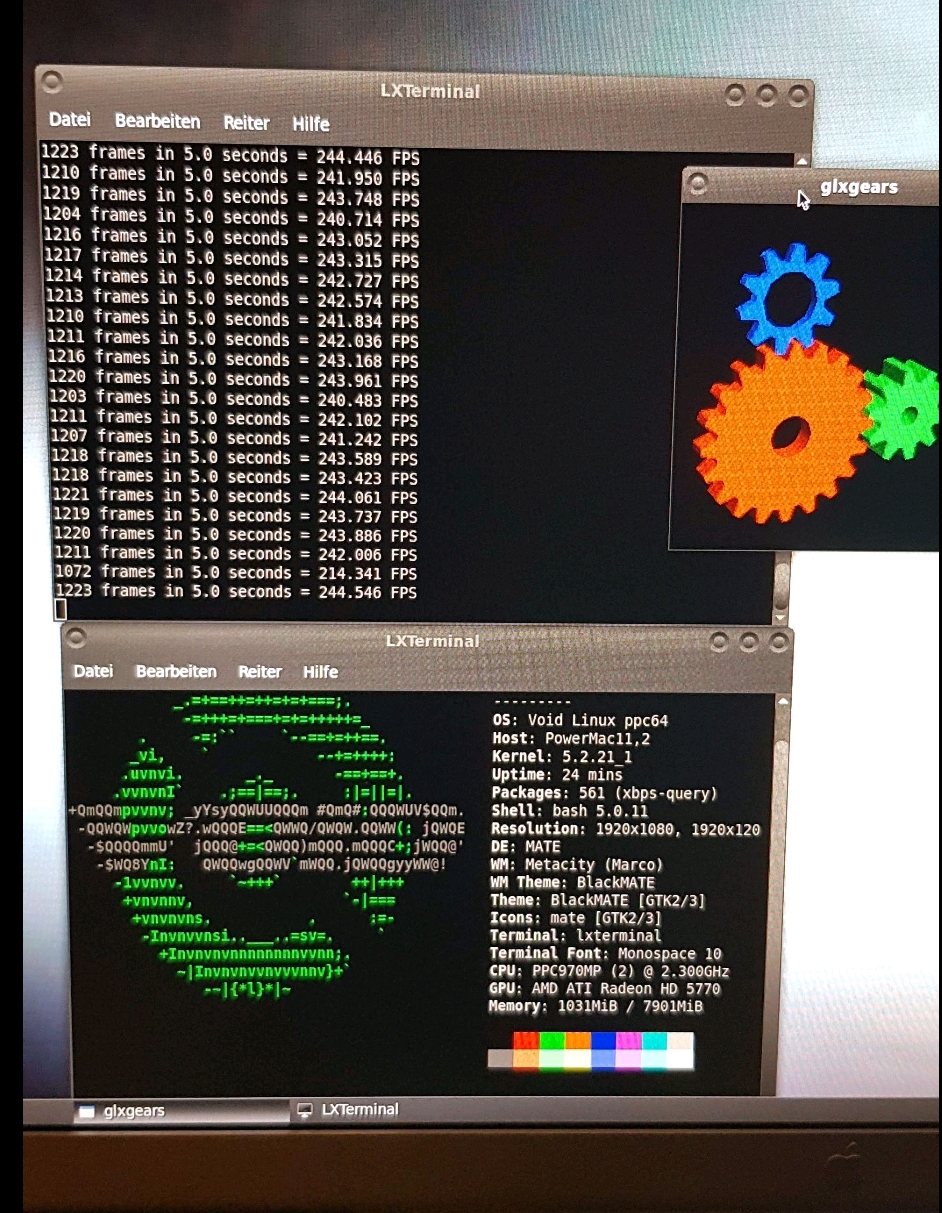 To give you a taste, here's a 2005 Power Mac G5 running latest Void and a bunch of stuff, like 5.3.x kernel, latest Firefox 69 (still some minor color brokenness but it's largely ok, works very usably, a ppc32 port is in progress too and I have it building, but it doesn't run yet), smooth h264 video playback (1080p) with no framedrops and high quality opengl output in mpv, etc.