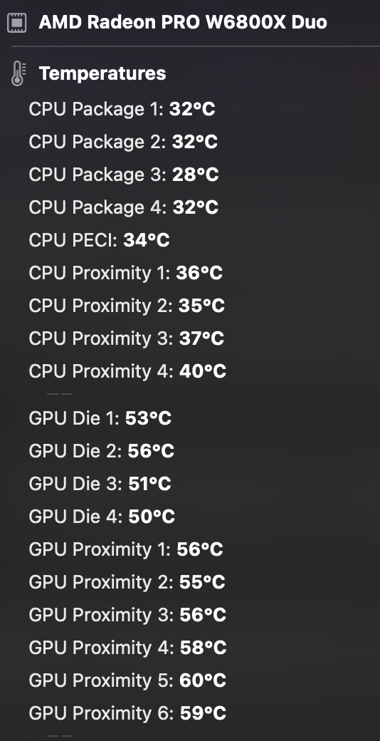 Also, one of my intake fans with the 6800Duo installed was consistently running at over 800 rpm vs the 500 rpm at idle for the Radeon Pro. What's strange is that it was intake 3 fan rather than the intake 1 fan where the card was located. During my Heaven tests, though, the 6800 Duo was running hotter than the Radeon Vega Duo.