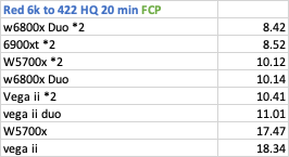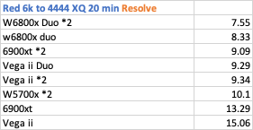 Export Red 8k to 4444 XQ - surprisingly the two single Vega ii got a time of 4 min 18 sec, which beat 4x W6800x Duo that had 4 min 47, just 5 seconds faster than a single W6800x Duo at 4.52.