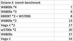 But is illustrative that is now eyeball deep in XDR Display connection "costs" and/or something that deeply leverages Infinity Fabric links ... not tons of tractions for the MPX modules. The non tested W6900X probably just completely fails on Performance/$ , but there probably a few wins there on the 6800 based alternatives.