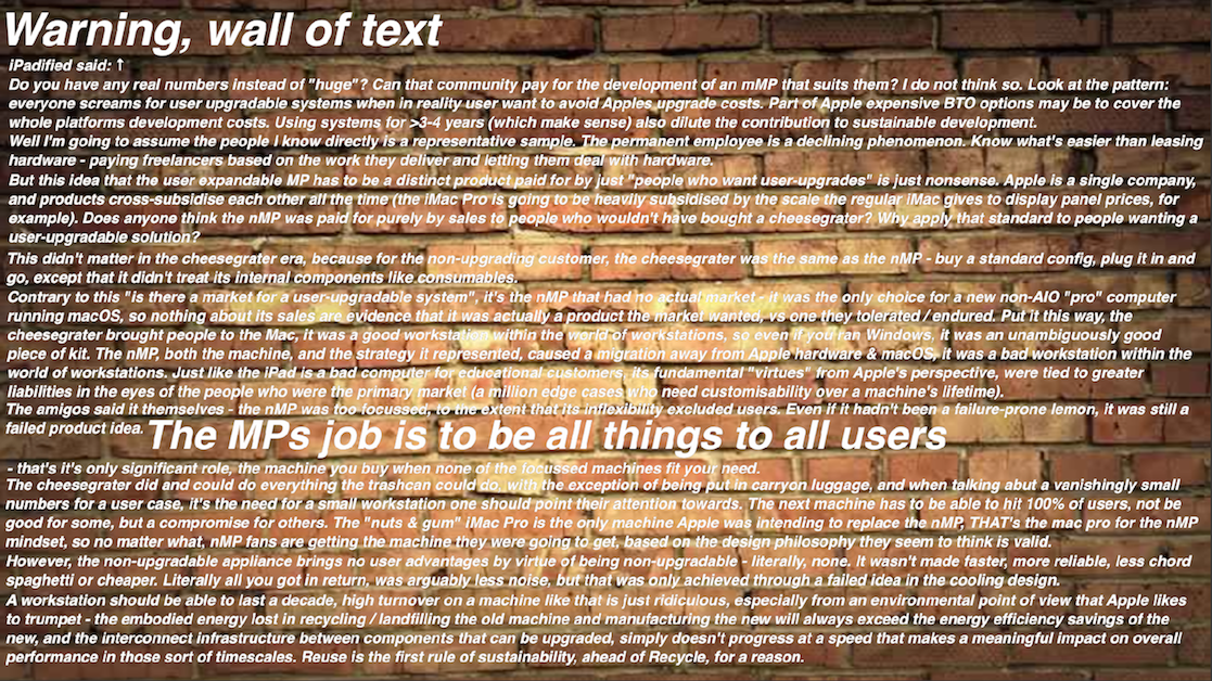 Contrary to this "is there a market for a user-upgradable system", it's the nMP that had no actual market - it was the only choice for a new non-AIO "pro" computer running macOS, so nothing about its sales are evidence that it was actually a product the market wanted, vs one they tolerated / endured. Put it this way, the cheesegrater brought people to the Mac, it was a good workstation within the world of workstations, so even if you ran Windows, it was an unambiguously good piece of kit. The nMP, both the machine, and the strategy it represented, caused a migration away from Apple hardware & macOS, it was a bad workstation within the world of workstations. Just like the iPad is a bad computer for educational customers, its fundamental "virtues" from Apple's perspective, were tied to greater liabilities in the eyes of the people who were the primary market (a million edge cases who need customisability over a machine's lifetime).