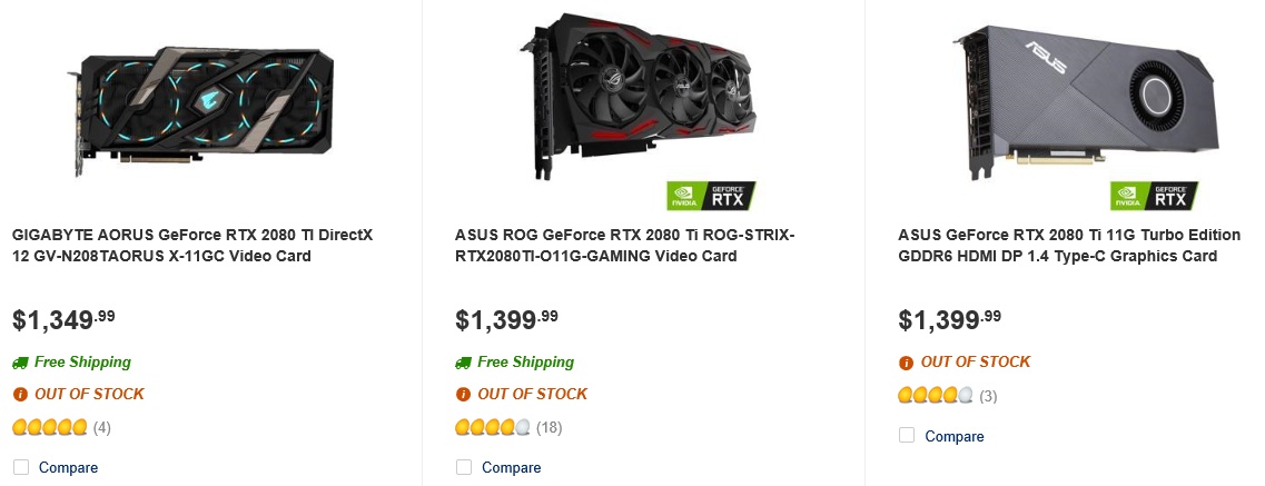 CDW is out-of-stock on most models.... https://www.cdw.com/search/?key=2080 ti&ctlgfilter=&searchscope=all&sr=1Other vendor sites such as Newegg have all of those 2080Ti cards in stock; bhphotovideo.com also has the Titan RTX card: