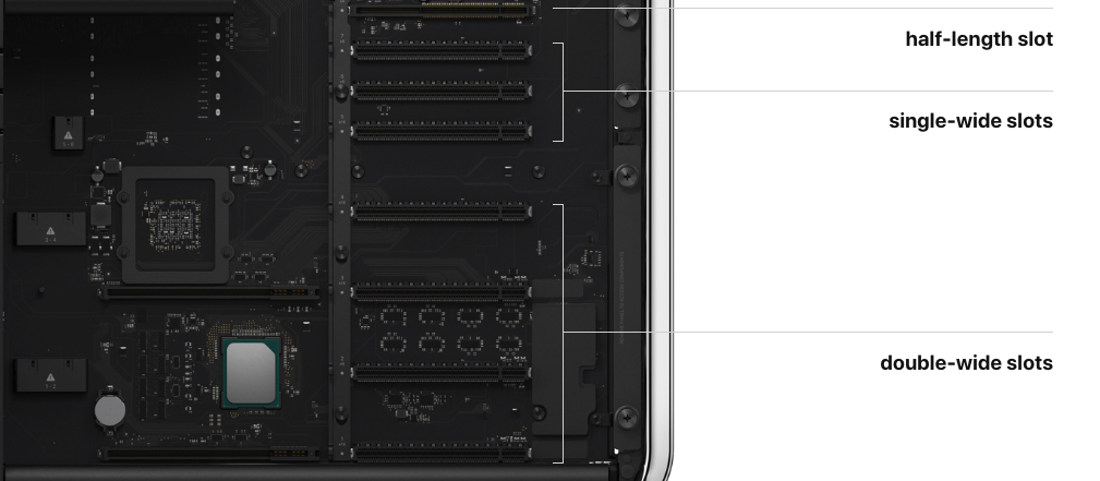 P.S. If plug in Apple's Afterburner card into slot 5 the 6-pin power port isn't all that great to get at either. That one though is offset enough so that the inputs to the power sockets are a bit above the slot space that relatively thin card will occupy. The Afterburner card probably won't be happy with really hot neighbors on both sides that are relatively hot.