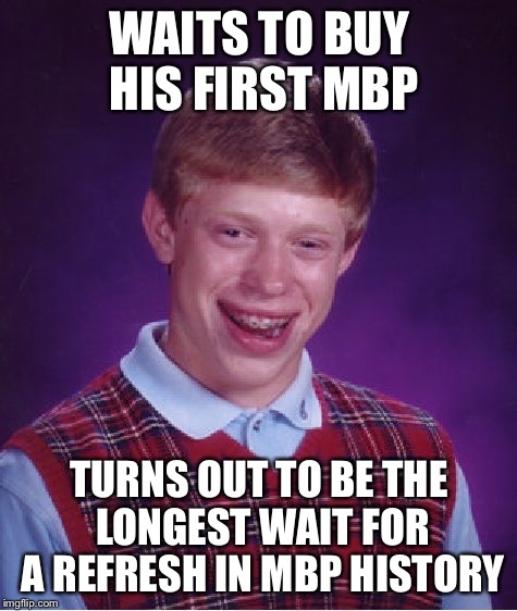 That's how long it's been since the last refresh. I had no idea I'd be entering into the longest refresh period in recent MBP history when I started waiting for my first Mac. Of course, this laptop has been sought after by many here since this thread was created exactly three years ago. I posted in this thread for the first time on page 28 on July 31, 2015, my fourth post as a MacRumors member. I wasn't even a big Apple fan back then; this thread made me an Apple fan. Apple events are now something I look forward to as much as a holiday or my birthday.