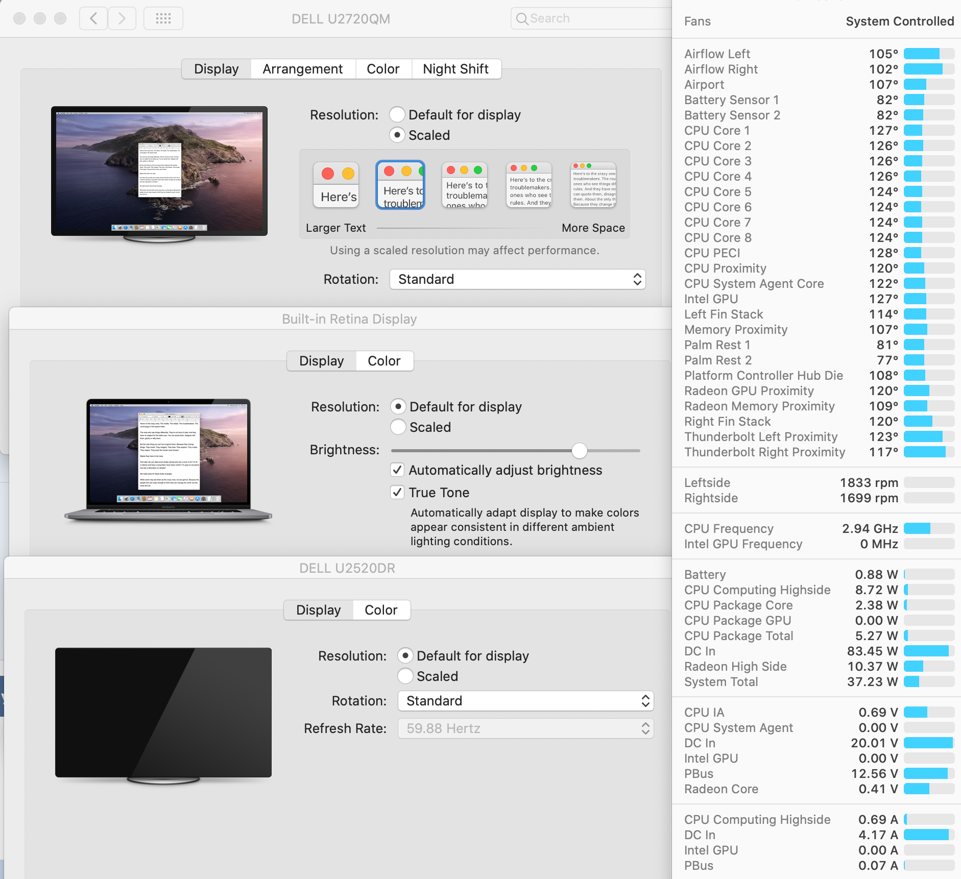 It's going to warm up some when you add displays...but my 5600M MBP warms up way less than my 5500M MBP. The most I've ran is two 4Ks and a QHD. Performance was not significantly impacted. This is a 4K, a QHD, and the built in (all 60 Hz). There isn't a lot of activity other than the photoanalysisd, which is using a small amount of both CPU and GPU (idle GPU power draw is about 8-ish watts in this scenario).