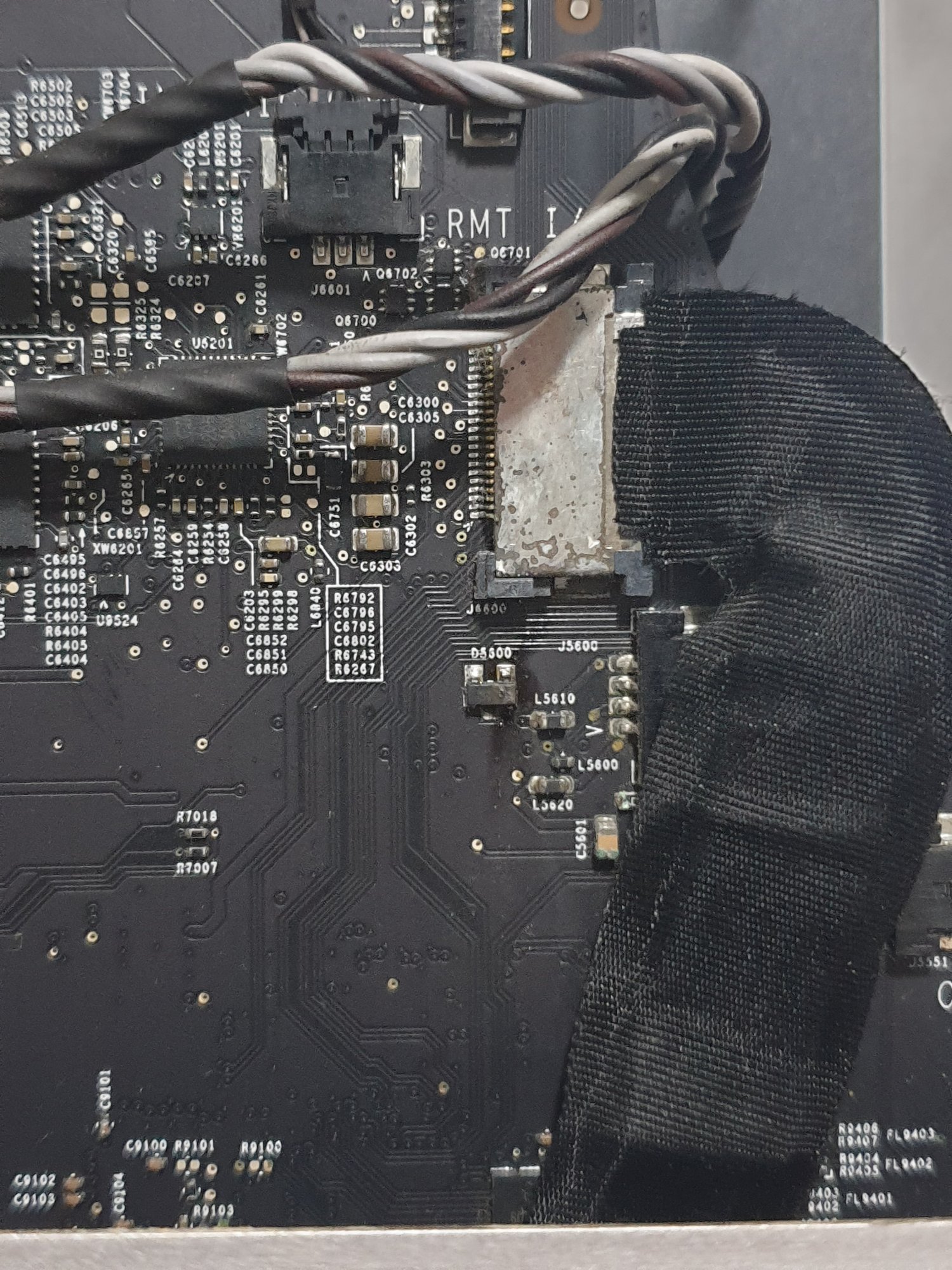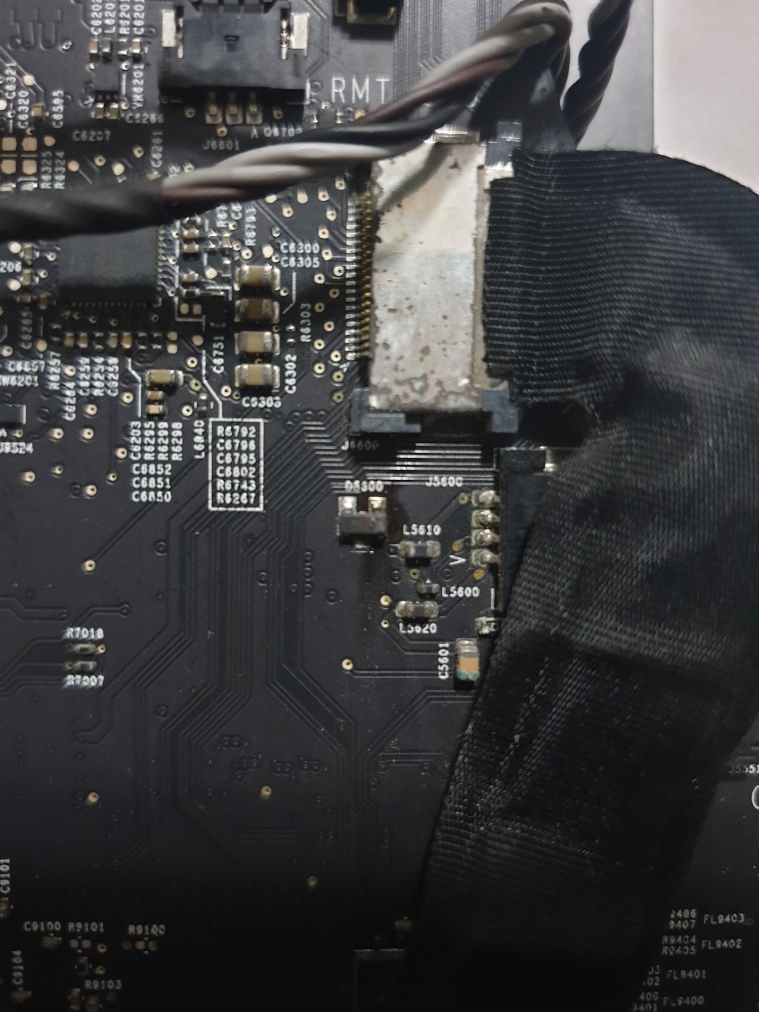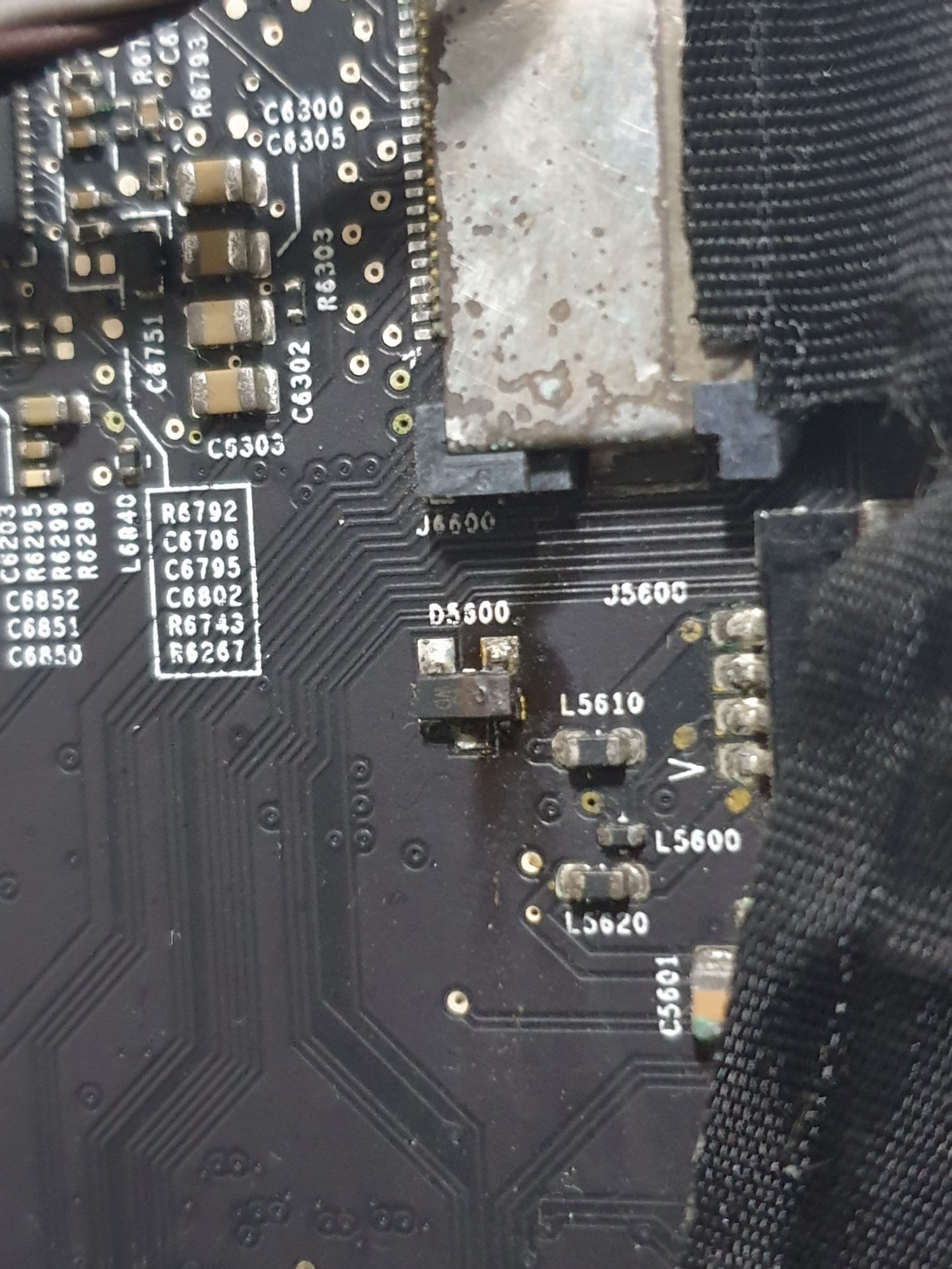 Bought an iMac 27inch 2009 core 2 duo version. Cannot power on when I first got it. So I dismantled it and check. Switch on the mains and the led 1 lights up, tried to power on, doesn't respond. So I was checking things out seeing if the connectors are in place. found the ODD fan wires loose, so I took it out and clean it up. Forgot to plug it back in and turn on the iMac. Saw the MOSFET D5600 or D5300 smoking. Would like to seek for expert's help here, what could have caused the MOSFET to burn. What component should I buy to replace. Please refer to the attached picture.