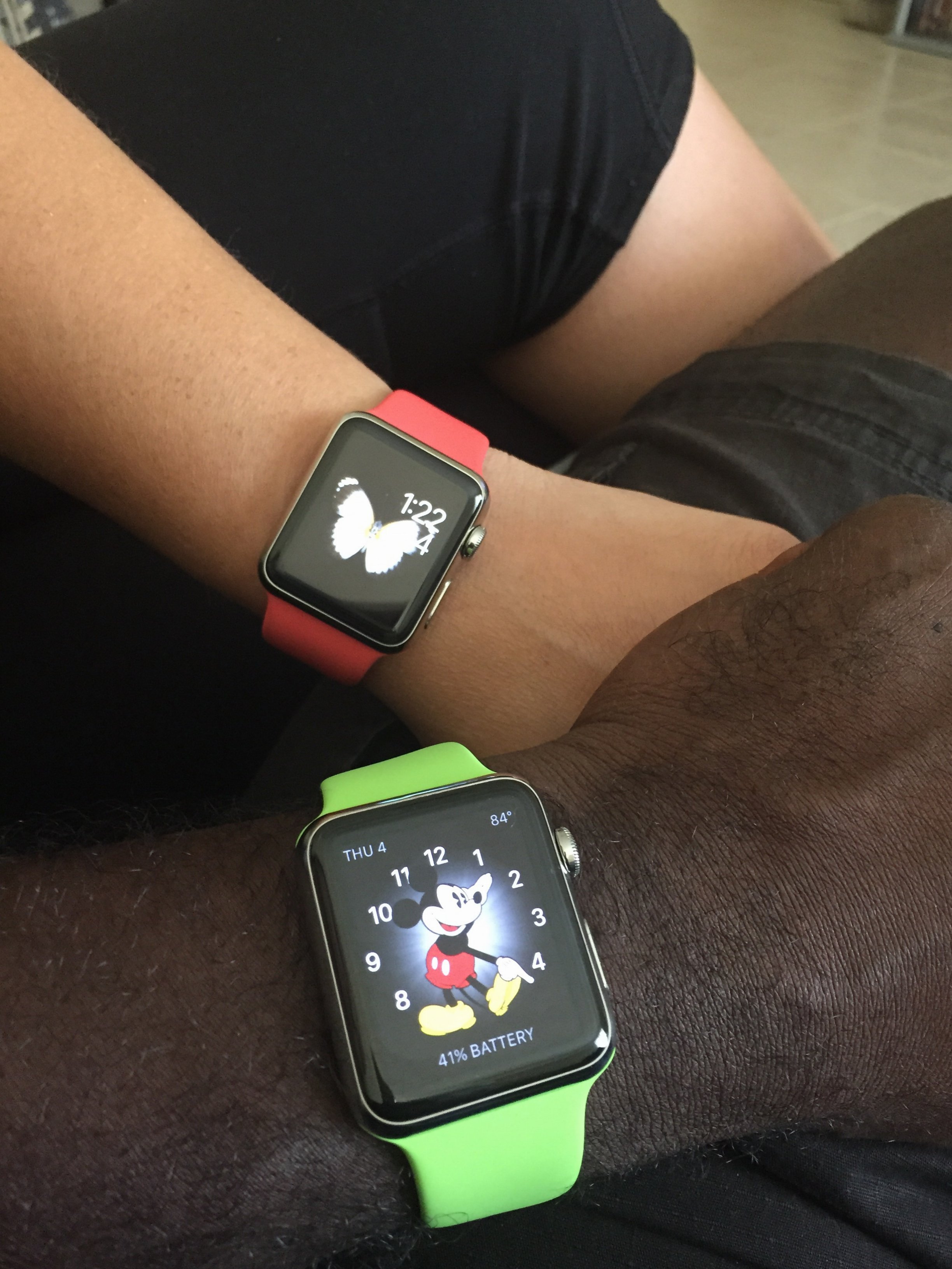 All my watches that I have through out the years, are SS with sapphire crystal. I tried the sport on at the Apple Store on launch day. And it's just not for me, just didn't look and feel like a real watch to me. So when I got home I ordered a 38mm SS for the wife, and 42mm SS for my self. Here's a another photo the wife and I in sport mode with the SS.