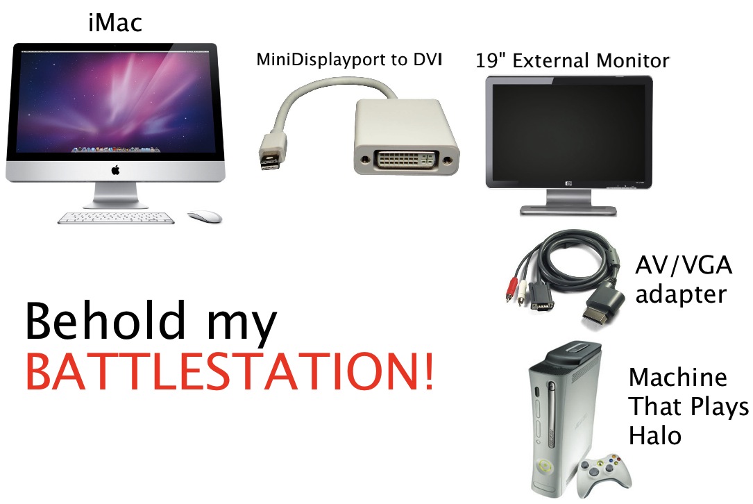However... If the iMac simply had an HDMI port on the back, I'm quite sure I would be able to connect the Xbox directly to the iMac and not have to deal with an extra screen. But of course, that's not possible because the iMac has no HDMI ports or even VGA or DVI ports... the only way to access this ultra-sexy 27" display is through the thunderbolt ports.