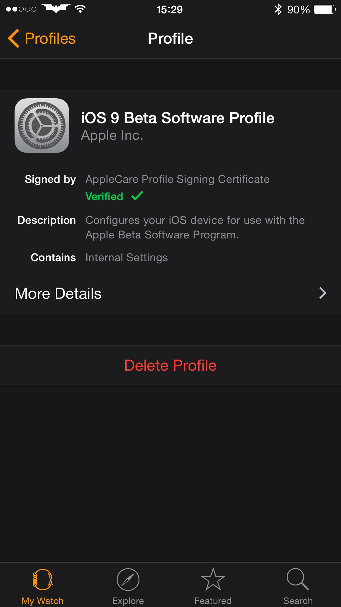 Correct, and if you go to the Apple Watch App on the phone and check for an upgrade, it will say 1.0.1 is the current version. It doesn't see the Developer O/S 2.0 Beta 3You have just installed the iOS 9 PB profile on the Apple Watch. There is no WatchOS Public Beta.