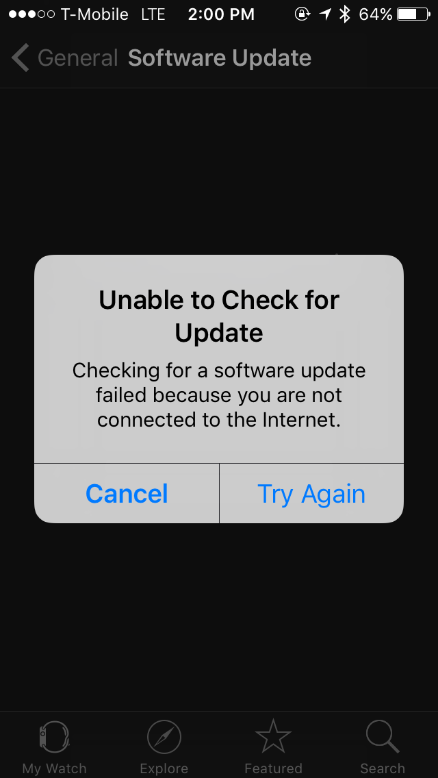 I've tried both lte and wifi and I am connected to the Internet. No clue why this error is happening.Funny it says you are not connected to the internet. Problem with T-Mobile? Try Wifi or see if you actually have internet.