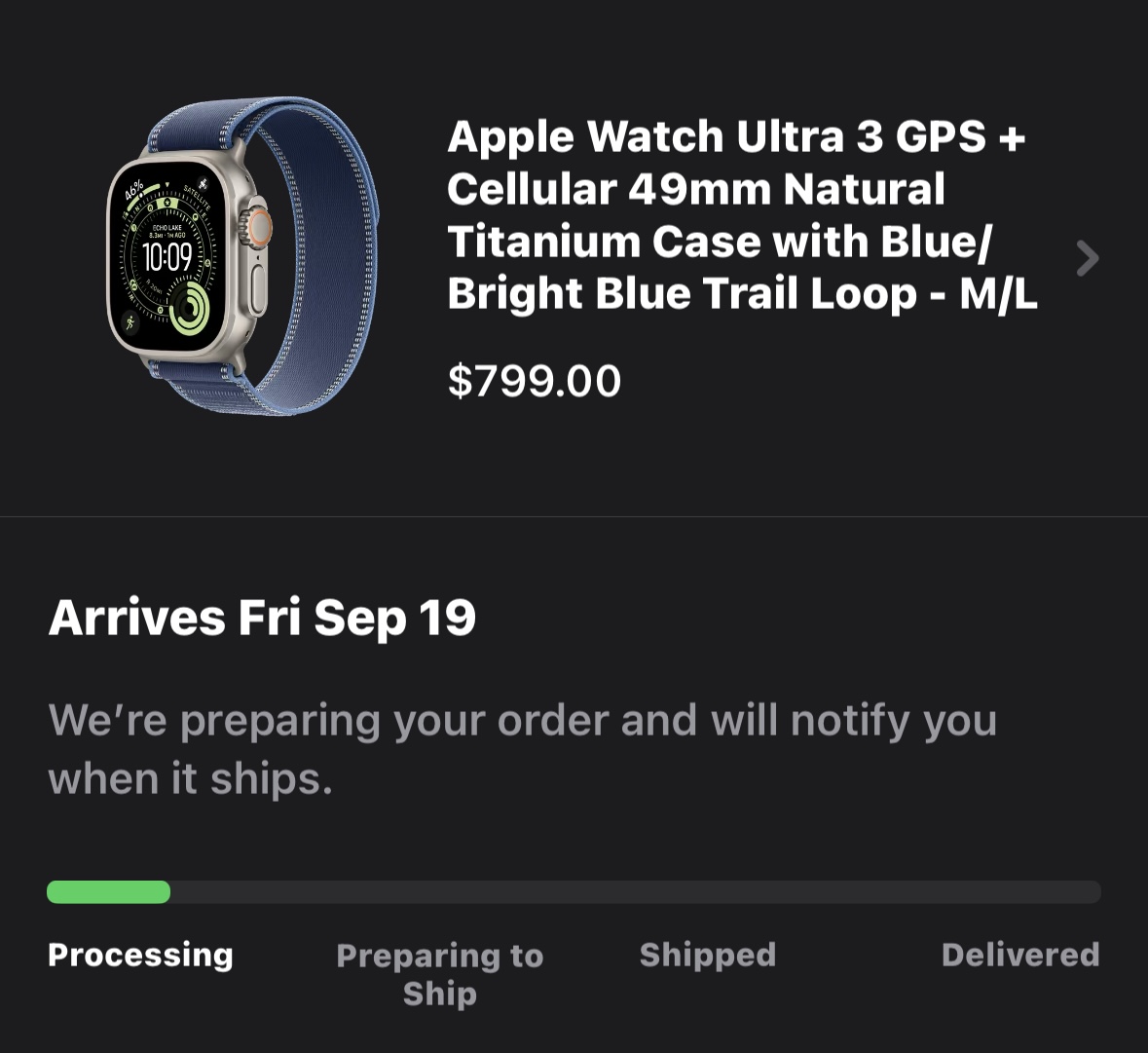 I pre-ordered a black Ultra 3 + AirPods Pro 3 immediately after the event on Tuesday with a 9/19 delivery on both, but my order status hasn't changed from "processing". I saw quite a few people on other threads saying theirs moved to "preparing to ship" from Thursday onward, but it seems like I'm stuck/fallen behind. I haven't seen any authorization reach my credit card yet, either.
