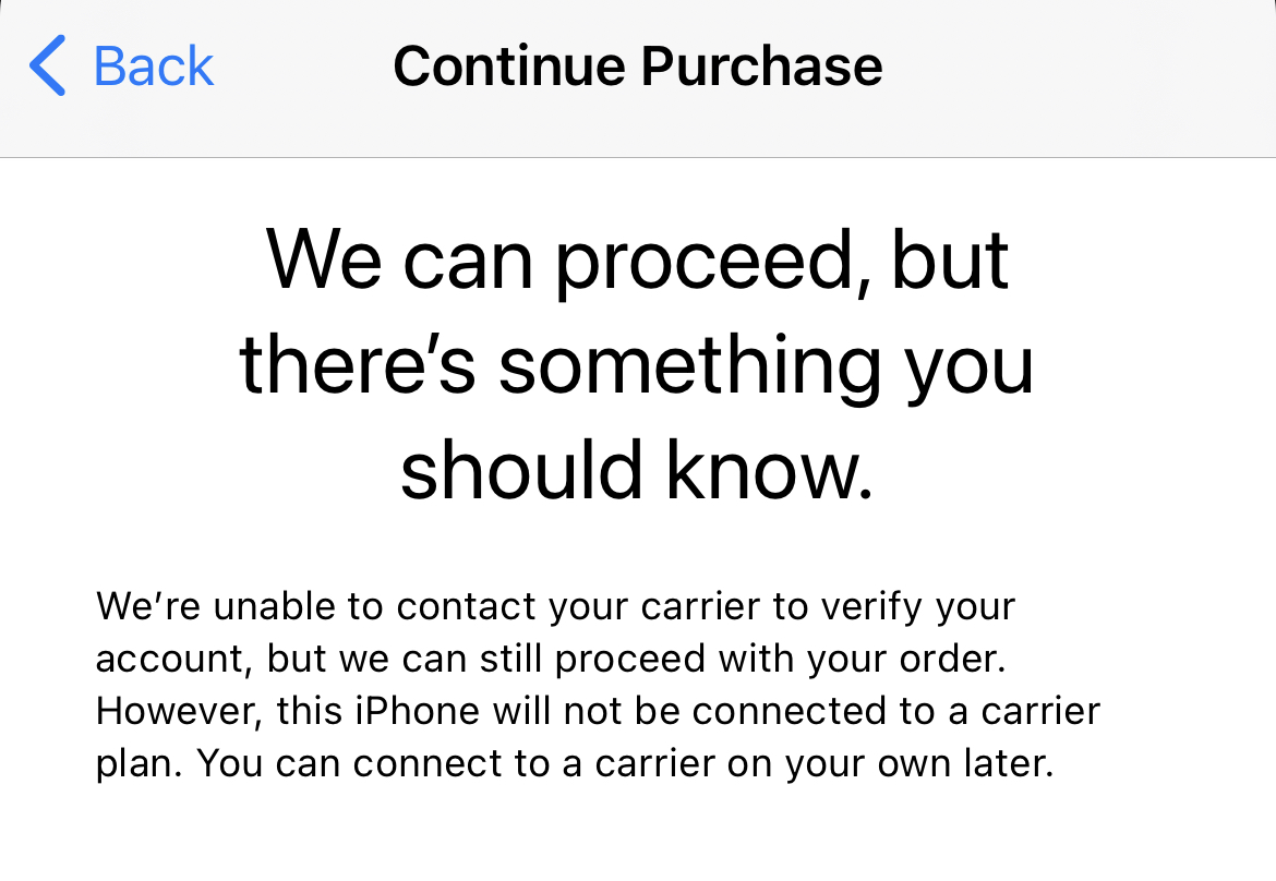 “We’re unable to contact your carrier to verify your account, but we can still proceed with your order. However, this iPhone will not be connected to a carrier plan. You can connect to a carrier on your own later.”