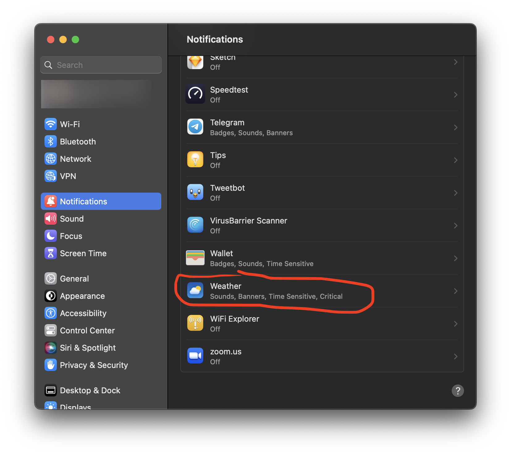 Put weather widget in notifications center. Close it. Check notifications settings now in system settings and see if you have ability to right click and “allow” notifications….