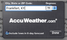 I don't know what's going on anymore with the weather widget. I tried restarting, then re-doing all the steps from before, t's still not working. Actually it's stuck showing Cupertino weather all the time now, even though my city is selected in the city selection window (when you click the "i" at bottom right corner). Very odd.