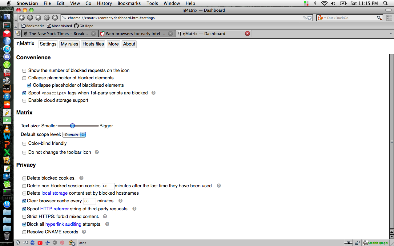 With most Mozilla browsers reliant on FF52 or lower (TFF, incl. the Intel build, being one case), I have a copy of uBlock origin 1.16.4.5 handy. I also keep around both the original uMatrix 1.0.0 and also 1.1.4 around, depending on the browser’s limits. I think these are also what I used for Interweb and Interweb-PPC.