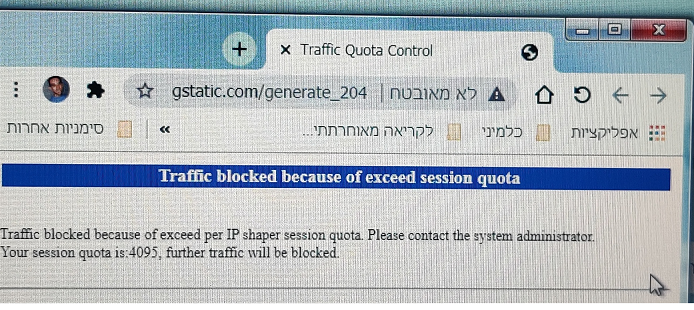 "Traffic blocked because of exceed per IP shaper session quota. Please contact the system administrator. Your session quota is:512, further traffic will be blocked."