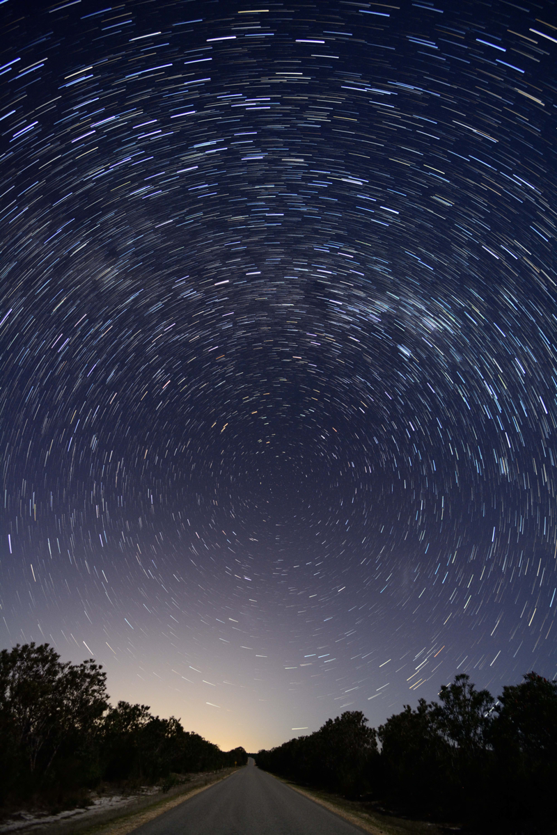 Good timing on the light trails! The dead palm frond, though, is distracting and keeps drawing my eye. Secateurs?