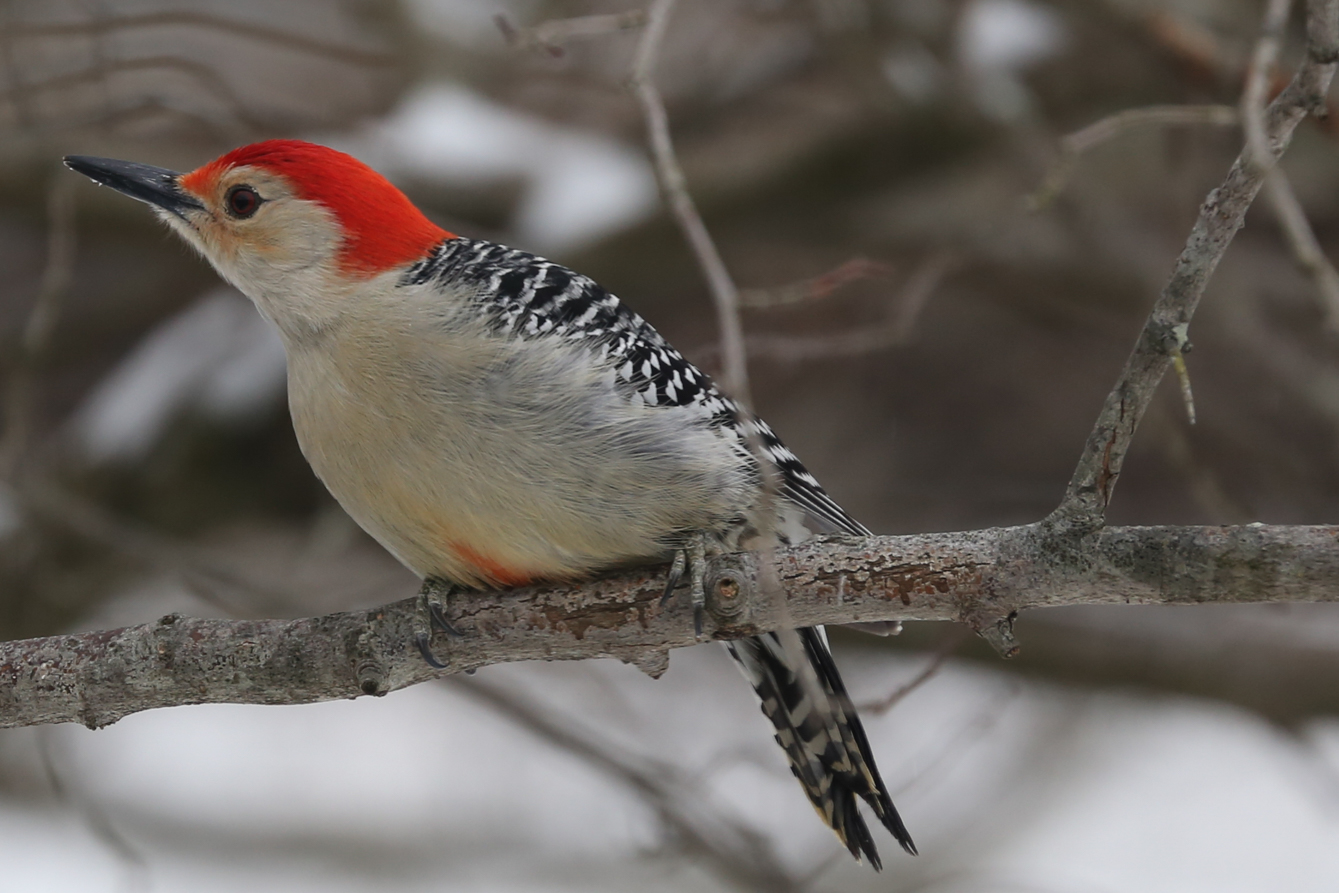 A lovely bird with good focus, colour and details to it. I would have taken a step to the left or two, so as to omit that branch that drops down across the frame in front of the bird. This could also have removed that snow on the branch directly behind the bird, taking it out of frame. I also would have repositioned the bird within the frame, so it had some more room to its left, where it is peering off to.