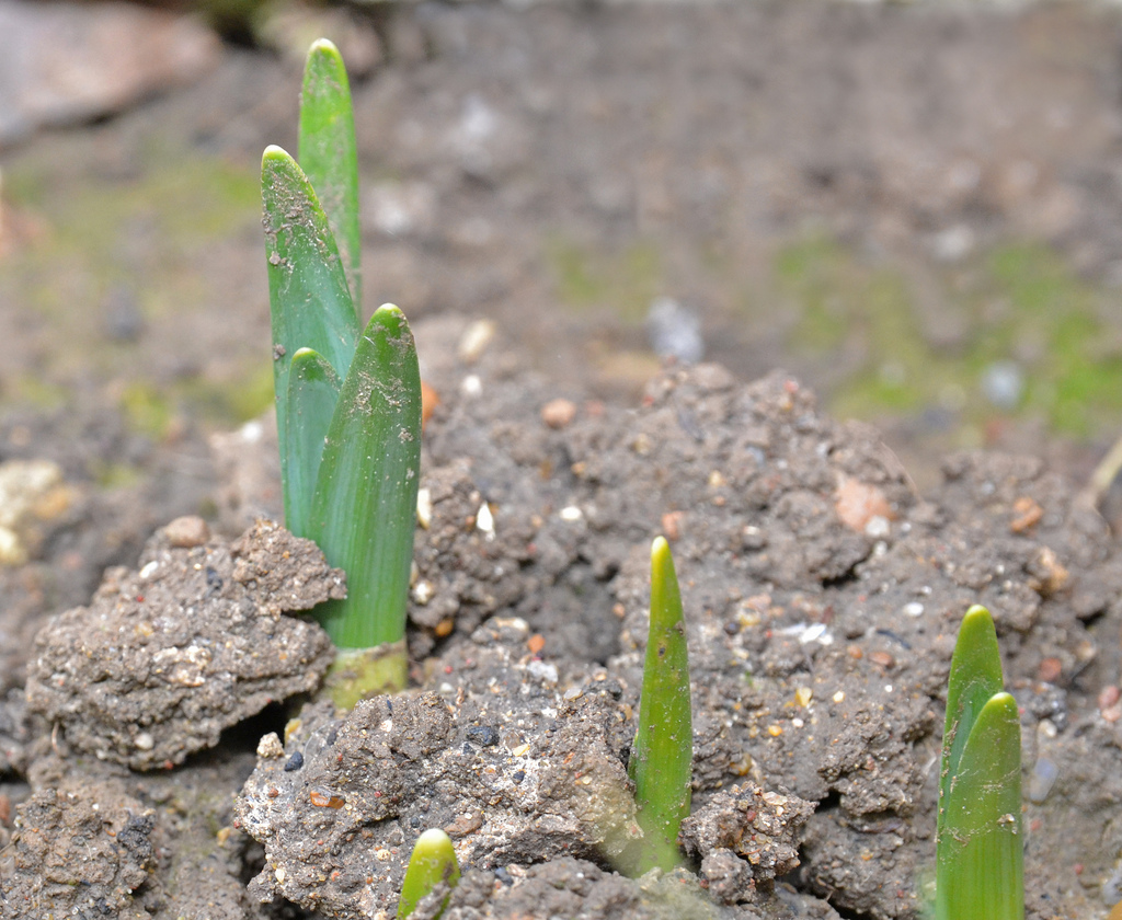 Soil thats beginning to dry out, and being pushed aside by the emergence of spring bulbs is what gives us all hope at this time of the year. (Looks as though youve got some clay there too!) Everything tends to look a little grey at this time so maybe just a very light touch on the saturation and contrast would help this photo to stand out. What do you think to cropping it square to miss out the right hand leaves that are half in and half out the photo and cloning out that one just peeping in at the bottom? Just a thought.