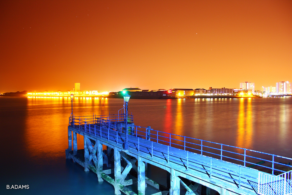 Schtumple Great, vibrant colors throughout that work together surprisingly well. The cool blue-greens of the dock are in stark contrast to the warmth of the city/town across the water. However; the horizon pretty much goes right through the center of the frame. Im curious if the contrast might more striking if that horizon was moved up or down. That said, what youve done still works for me even though it violates the rule but isnt that part of being creative?