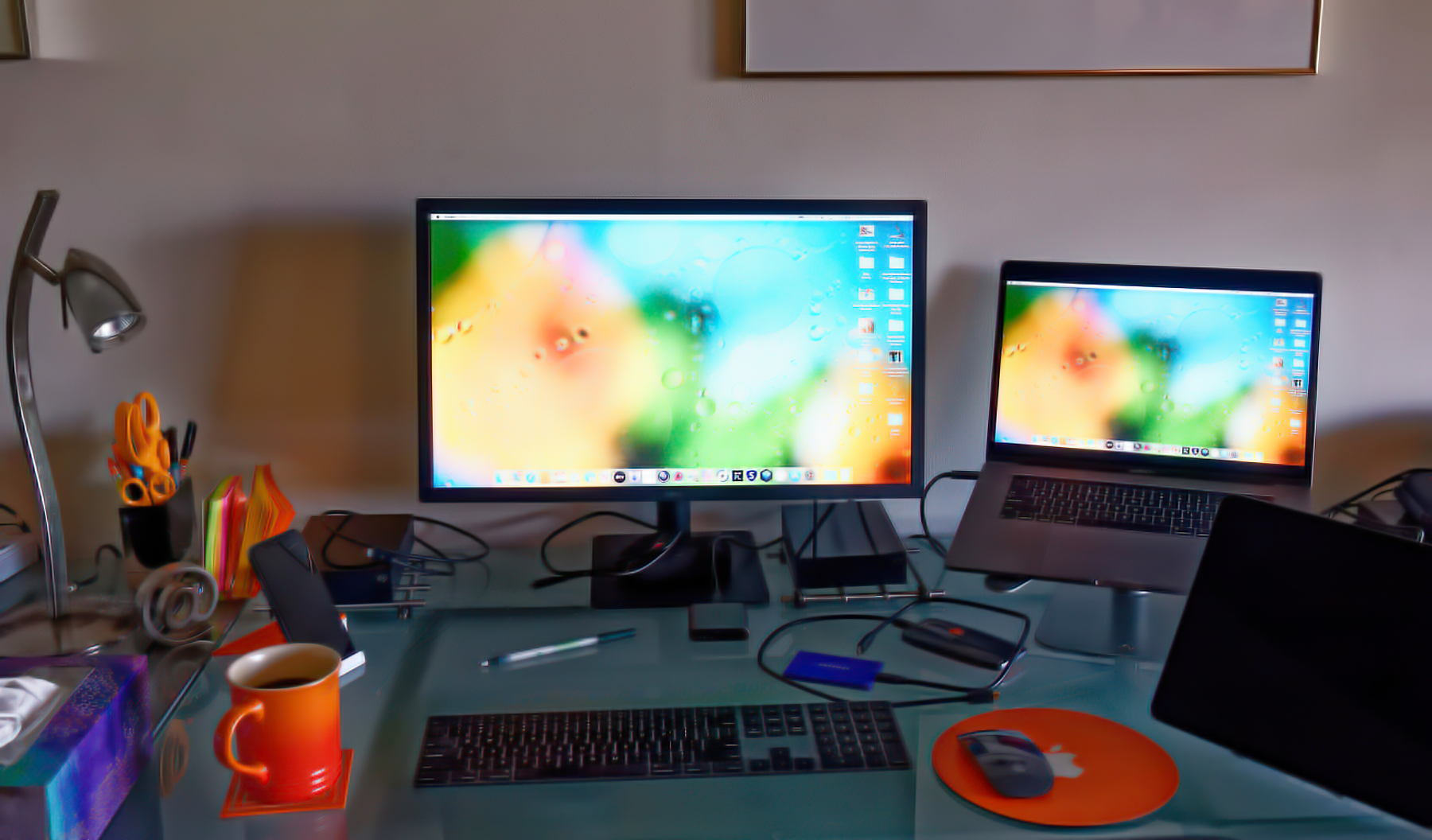 Right now I really don't have a workspace. This year I finally got rid of the CenturyLink branded router and got my Ubiquiti system configured. It is haphazardly stacked up as you see while waiting for new cabinetry to be build in my central access point. It is sharing a room with my art supplies and laser cutter. That's a sewing machine in the lower right and off cuts from the laser in the lower left. Outside the glass door is my lovely five foot wide backyard.@Laird Knox - Chaos can work for some. Hope you can find some sense of order with all that.