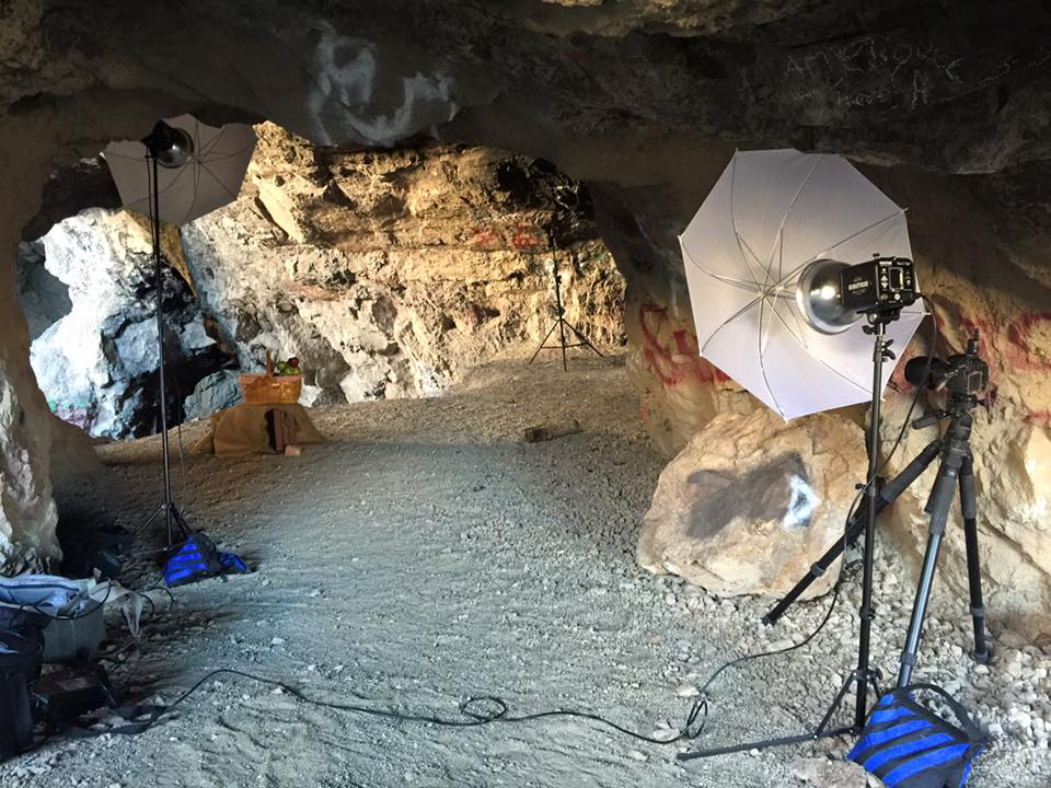 Here's another view where you can see all three lighting setups. Also a better idea of the cliff edge. I lost a roll of gaff tape over the edge.
